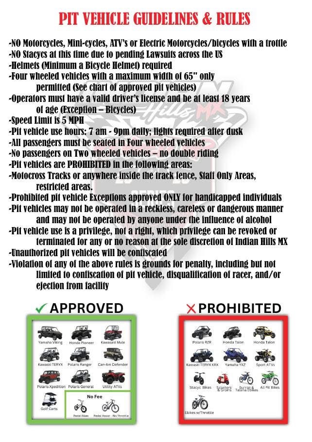 There will be NO two-wheel pit vehicles allowed. You MUST be 18 years of age or older to operate other 4 wheel pit vehicles. Upon entering the grounds,you must pay a $20 pit vehicle pass.
